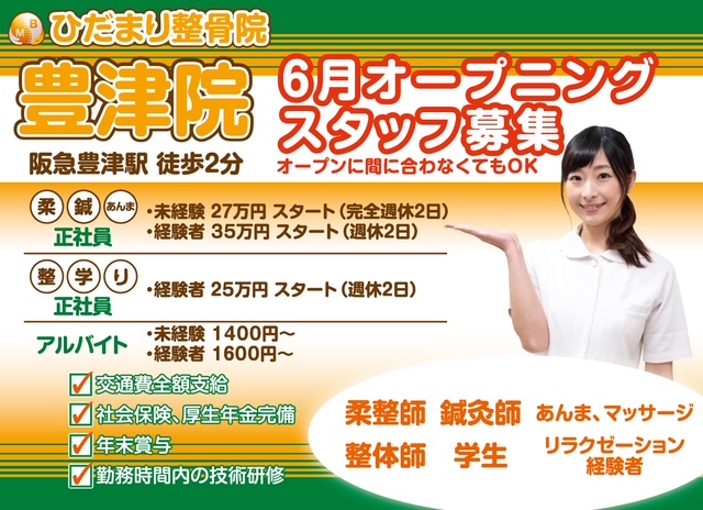 施術を中心とした整骨院業務全般 ・保険施術 ・実費施術 ・準備・片付けなど ・試用期間(6か月:条件の変動なし)