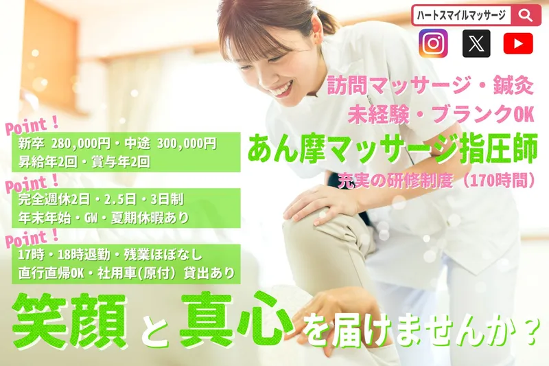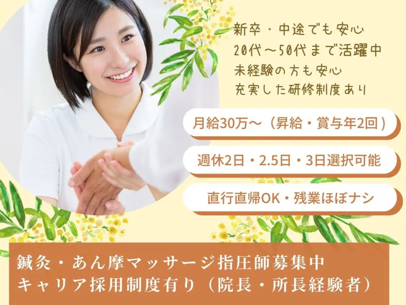 【こんなに働きやすいのに成長できる!】あん摩マッサージ指圧師募集!駅チカ×土日休み×18時退勤◎週休2~3日選択OK!