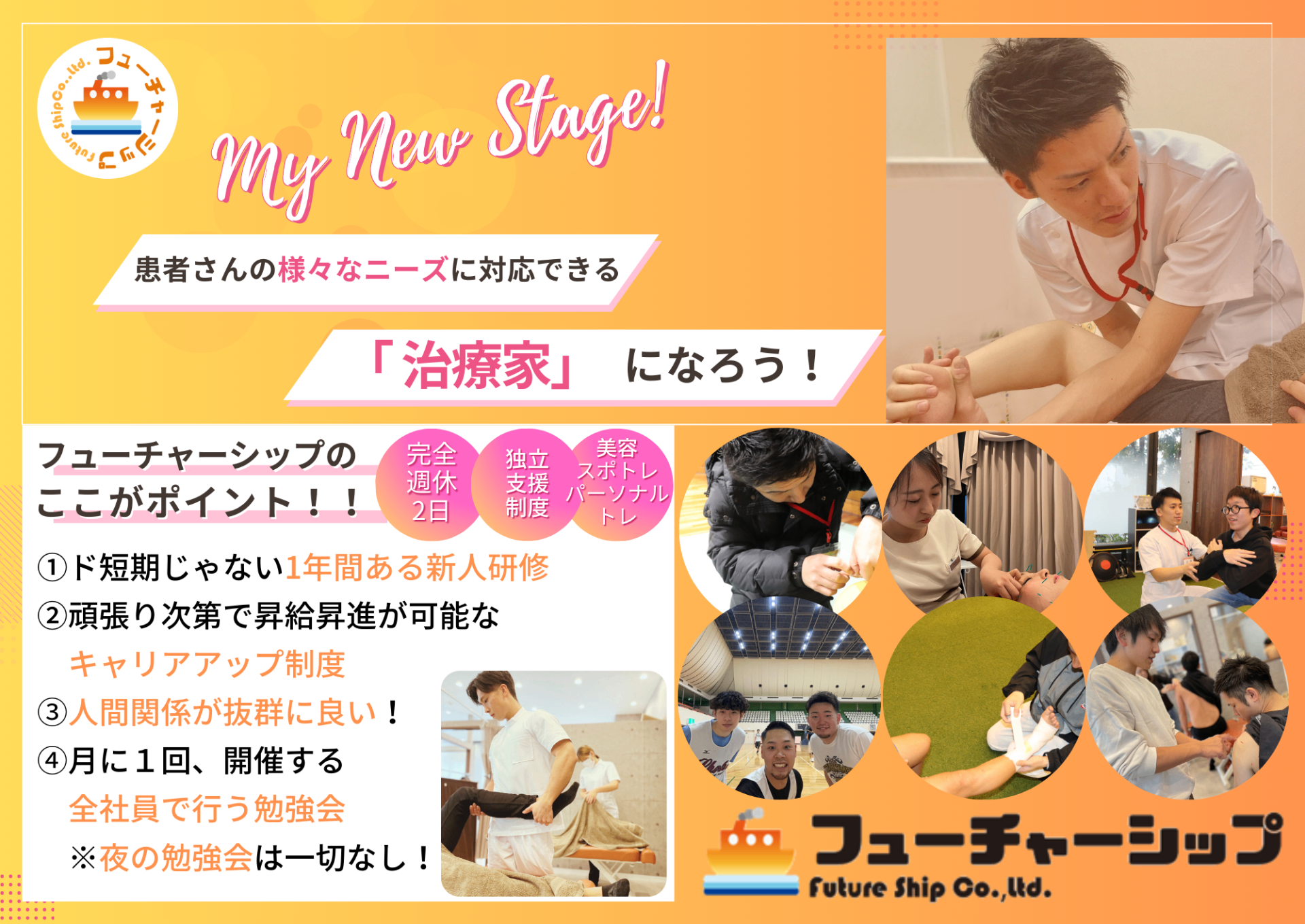 - 弊社は入社してくれた社員に将来、どんな先生になって欲しいのか? それは【患者さんの様々なニーズに対応できる治療家】です。 〇〇専門治療、〇〇疾患専門などと診る患者さんを限定するのではなく、筋・骨格・神経が原因で痛めている患者さんが目の前に100人いれば、100人の痛みを治せる治療家になって欲しい。 だからこそ、社員が成長できる環境をしっかりと整えております。 ① 業界の新人研修は約3ヶ月から6ヶ月が多い中、弊社の新人研修はなんと1年間も行います。 多くの手技を学び、その手技の精度を高め、患者さんに満足して頂くには詰め込みの数カ月の研修では無理だと考えています。 フューチャーシップでは、この新人1年目を治療家としての重要な期間だと思っているので、時間をかけて治療の基礎や技術、考え方、問診などを学んでもらいます。 ②月に1回、午前診療を休んで全社員で行う勉強会があり、この勉強会では様々な疾患の解剖学、治療法、ADL指導、来院指導などを学べます。 ※こうした勉強会の時間を業務中に確保しているので夜に行う勉強会は一切ありません! 楽しくお仕事がしたい方!⇒イベントが豊富でユーモアがある先輩が多数在籍! 社内で成長して役職を上げたい方!⇒独自のキャリアアップ制度があり随時、昇給昇進が可能です! ※女性専用のキャリアアップ制度もあり、役職に就かずとも能力に応じた昇給が可能です! 将来、開業したい!⇒独立支援制度があり、現在4名の独立開業の支援実績があります! 気になった方は是非とも会社説明会・見学会に来てください! ワクワクするようなお話が出来たら嬉しいです。