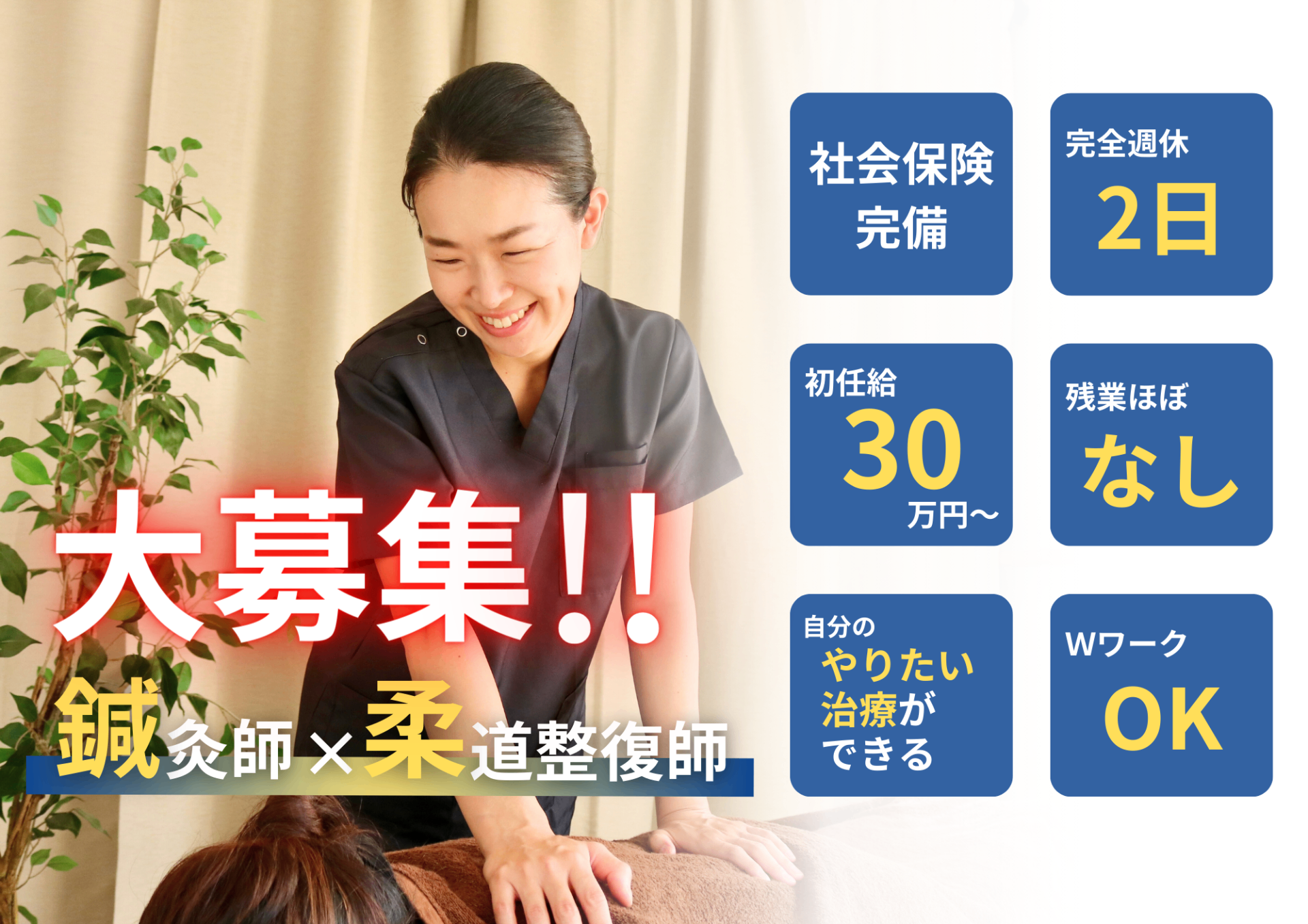 - 当院は『やりたい事に挑戦し、プライベートも充実させたい』 そんな仲間を探しています! ・19時閉店 ・残業ほぼナシ ・完全週休二日(今後変更の可能性あり) ・Wワーク可能 ・ノルマ無し!回数券などの押売りなし! 自由度が高く、どんどん自分のやりたい事(治療)に挑戦できる環境で 治療家としてのスキルを磨き、一緒に働きましょう! ・治療家として数年経ち、更なるスキルアップを目指す経験者の方 ・未経験やブランクのある方 どちらでも、ご自身の中に【なりたい治療家像】をしっかりお持ちの方を歓迎いたします! 出産によるお休みを経て復職したスタッフも現在活躍中 自費で挑戦してみたい方も大歓迎です! 少しでも気になっていただいた方は、ぜひ一度見学にいらしてください!